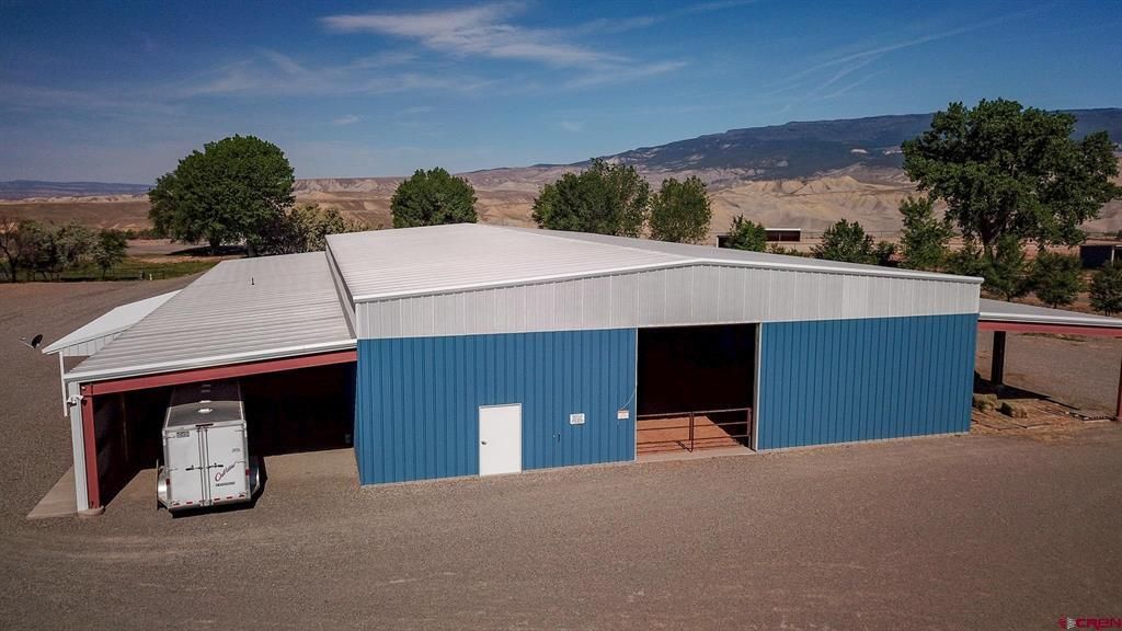 Mountain views, Amazing sunsets, Equestrian's Dream. Property highlights include: Arena building 16,000 sq ft. contains apartment, tack room, hot/cold water wash bay, equipment room, covered vehicle area, and room to build your Dream home. Arena building houses a 480 sq. ft. apartment. Large bedroom with walk in closet, 3/4 bathroom, 2 sinks. Full Kitchen with hickory cabinets, fridge, range/oven and microwave. Apartment is heated with Comfort Cove radiant heat system and window A/C for cooling. Adjacent unheated 250 sq. ft. room to apartment is fully finished, epoxy coated cement floor. Covered porch, relax after a hard ride or day. Indoor arena area includes: welded pipe fence, roll-up doors at each end, wood chip footing, small viewing gallery, frost free hydrant next to large foaling stall with cement flooring. The South side contains: Tack room 480 sq. ft., fully enclosed, heated (radiant), painted, epoxy coated floor, Wash Bay/Carport 420 sq. ft. with hitching post and hot/cold water to clean equipment, horses, lined with Poly Max sheets floor to ceiling, brushed cement floor, a small storage area and 220 sq. ft. equipment room is enclosed with cement floor. The North side roof forms a covered hay/equipment storage while Southeast has covered vehicle space with 220V outlet. Let's take a ride, step outside to the outdoor arena with welded pipe fencing. It's approximately 1 acre. Round pen is built with solid steel sides, 60' diameter with sand footing, frost free hydrant close up. First horse pen has Ritchie Omni 1 automatic water, 196 sq ft. loafing shed, frost fee hydrant on approximated 1.60 acres. Second pen, again, has frost free hydrant, loafing shed on approximately .85 acres. Tree/Grass area has mature trees providing shade, while horses graze within electric fenced confines. Water, yes, Property has irrigation rights from 2 ditches (Stillwater and Hal) which are located off property. All irrigation lines on property are underground (a few open ditches). Fifteen acres of the property are in cultivated grass/alfalfa hay fields, usually producing 2 to 3 cuttings per year (depending on drought) and approximately 1,500 bales. Water is split 75% of rights for this property and 25% to adjoining 11309 Running Deer Road(Lot 1). Gravel driveways surround the property with main drive shared right of way. This well built and thought out equestrian operation could be just what you've longed for. Come look and take in the beauty of this horse lover's property and Western Colorado