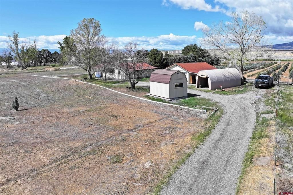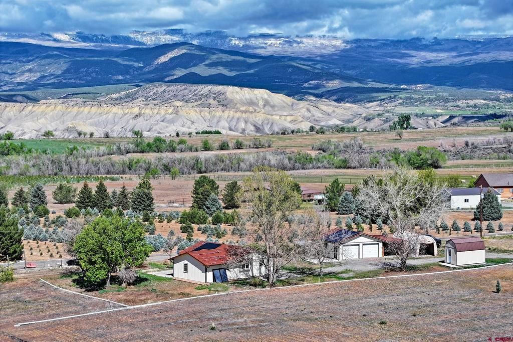 Experience country style living on 1.81 acres with irrigation just outside Eckert, where sweeping views of the San Juan, Grand Mesa, and Uncompahgre mountain ranges surround this private country property. Tucked along a graveled lane bordering an evergreen tree farm, this acreage offers quiet, privacy, and usable land ideal for those seeking a rural Colorado lifestyle. Step through the covered entry into a cozy 2 bedroom, 1 3/4 bath home featuring an open living and kitchen area filled with natural light. Enjoy generous counter space, attractive wood cabinetry, and included appliances, seamlessly connecting to a spacious living area designed for everyday comfort. Double glass doors open to an outdoor patio and walkways, creating an inviting indoor-outdoor flow. The primary suite offers private patio access, a tiled walk-in shower, vanity, linen storage, and a large walk-in closet. A second bedroom also includes a walk-in closet. Additional features include a full bath, hallway pantry, storage closets, and a laundry room with washer/dryer hookups. Comfort and efficiency meet country charm with recessed lighting, forced air heat, in-wall A/C, window coverings, and a blend of vinyl, cork, tile, and carpet flooring. Outside, the irrigated acreage supports crops, hobby farming, or animals with water shares, garden area, frost-free hydrant, and established trees and shrubs. Relax with a second open patio. Outbuildings include a detached 2-car garage with office and carport, greenhouse, storage shed, and a Quonset for RV or equipment storage. Septic system and city water tap in place. Located minutes from Highway 65 with easy access to Eckert and Cedaredge services and residential need, and within an hour of Grand Junctionâ??the Western Slope hub for shopping, medical, regional airport, and I-70 corridor access. Ideal for buyers seeking a Colorado country home, acreage property, or investment opportunity.