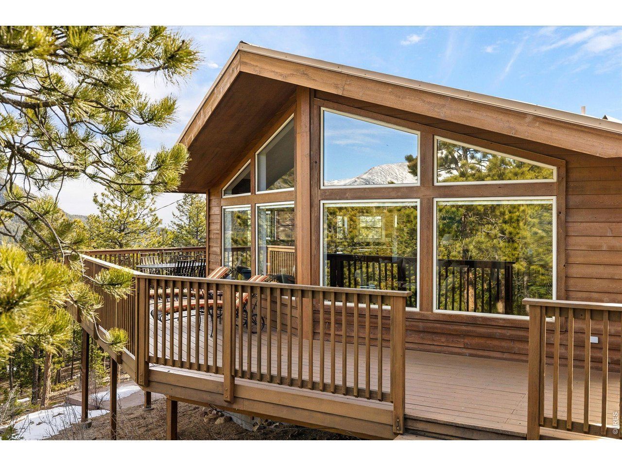 Sweeping, unobstructed views of the Continental Divide and the iconic Mount Meeker are captured from this turnkey mountain retreat perched in the serene foothills of Rockledge Park. Immaculately maintained, this residence is defined by lofty vaulted ceilings and a light-filled open floorplan, where dramatic floor-to-ceiling windows frame snow-capped peaks and ever-changing skies. A wraparound deck extends the living space outdoors, offering an extraordinary setting for entertaining or quiet moments immersed in nature. Rich Alder wood doors and Hickory hardwood floors add warmth and refinement, while a cozy HearthStone stove anchors the living area. A lower walkout level includes a separate entrance with a roomy recreational setting featuring a pool table/TV, bedroom and 3/4 bath. When exploring the outdoors this property offers the freedom to roam the bordering National Forest, inviting endless adventuring right from the backyard, and includes a charming mini cabin with inspiring views. Set among gentle terrain and striking rock outcroppings, this peaceful sanctuary offers abundant wildlife sightings and sounds, unmatched privacy and convenient access to Lyons, Boulder, Rocky Mountain National Park and Eldora skiing.