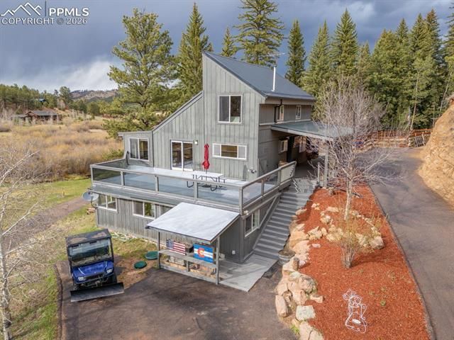 Perched above a peaceful meadow with a flowing creek, this 2.507-acre property (spanning three lots) offers a true Colorado mountain lifestyle. Wildlife frequents the property, and mornings begin with birdsong in a serene, private setting. Enjoy expansive outdoor living with a three-sided deck (covering 2 sides) featuring stunning stained glass accents, a fenced yard ideal for pets or gardening, and a 10x20 storage shed. Inside, you’re welcomed by a main-level bedroom and bathroom, followed by an open-concept living and dining area with soaring vaulted, beamed ceilings. The kitchen is surrounded by walls of windows, creating a treehouse-like feel, and features endless counter space, recently updated stainless steel appliances and incredible views of the creek and meadow. A spacious secondary bathroom with tile accents completes the main level. Upstairs, a spiral staircase leads to a loft with two flexible living spaces, separated by a large closet and built-in storage. The lower level offers substantial bonus square footage ready for your vision—perfect for a home office, workshop, gym, classroom, or additional living space—plus abundant storage throughout the home. Serviced by a private well (not part of the Westcreek Lakes Water District). Optional fishing club membership available. Located near 250,000+ acres of Pike National Forest for endless outdoor recreation. A rare opportunity to own an idyllic Colorado retreat with space, privacy, and endless potential.