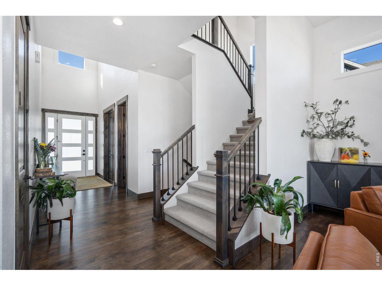 Luxury Living with Breathtaking Views! Take a look at this better than new home with high-end finishes and gorgeous views of Houts Reservoir. From the moment you step inside, you are welcomed by 10 foot tall ceilings throughout, large windows providing year-round natural light, automated Hunter Douglas blinds, hickory hardwood floors with elegant natural wood trim, and beamed ceilings. Step into the kitchen, a food preparer's dream. Complete with Tharp cabinetry providing a plethora of storage, a spacious kitchen island, Stainless Steel appliances, and a walk-in pantry. This home features a main floor bedroom and bathroom, so main floor living is easily attainable. The expansive upstairs primary suite features beamed ceilings, views of the reservoir, and a sliding barn door that takes you into the bathroom. The primary bath features heated marble floors, shower and freestanding tub, coffee bar with beverage cooler, and expansive his/her closets, all with luxury finishes throughout. This home also features 8 foot tall solid interior doors. The walkout basement is complete with a large rec room, wet bar, and a bedroom and bathroom close to an exterior door that could also be utilized for a multi-purpose room for things such as homeschooling or a home business. One of the many standout features of this home is the views of the reservoir or mountains from almost every room! The finished garage is oversized in all directions with 10 foot doors, which makes the garage perfect for parking, storage, or workshop space. The large outdoor deck and patio space provides the perfect spot to take in the views and fresh Colorado air.