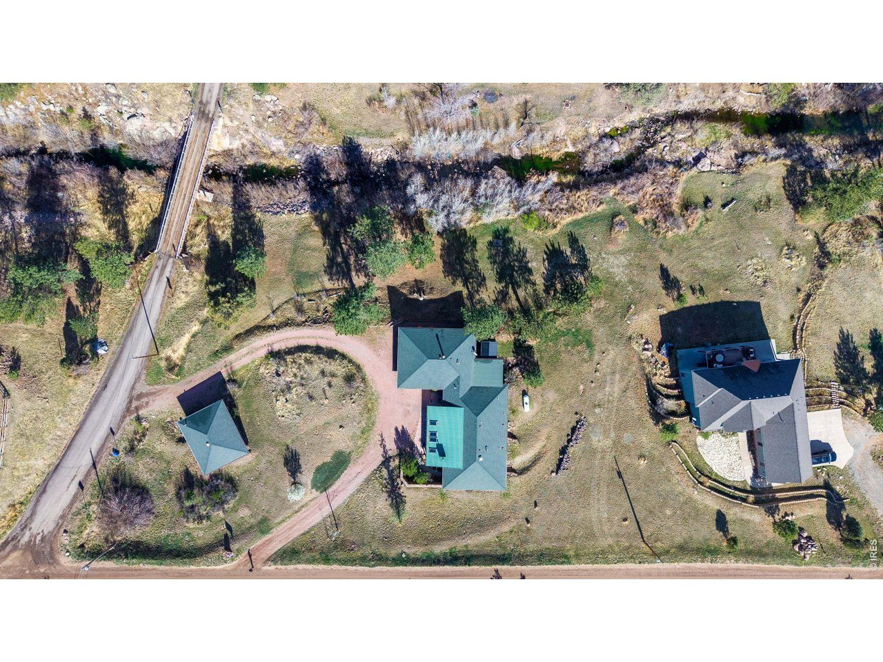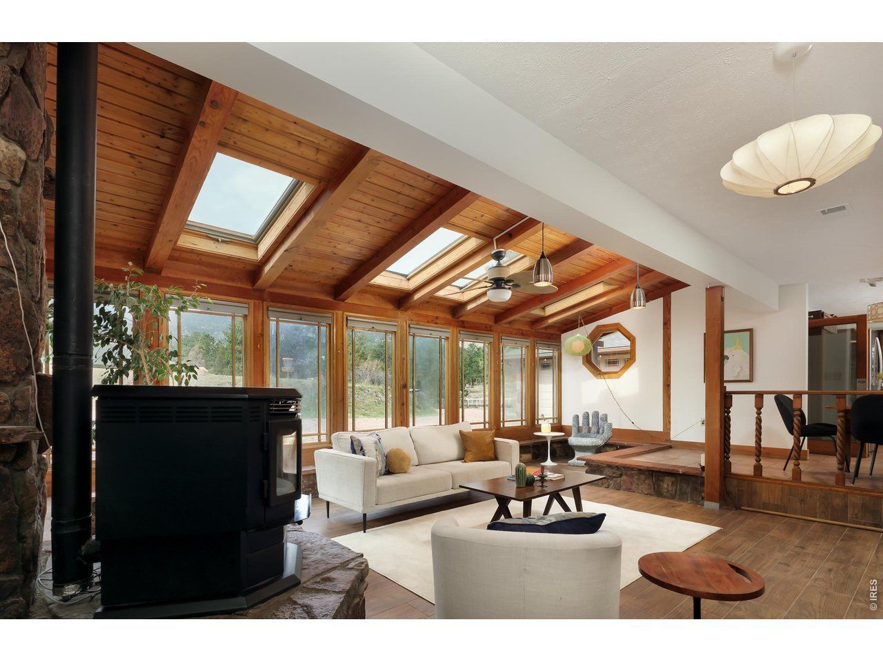 Tucked along the Little Thompson River, this 1.35-acre property in Pinewood Springs offers a front row seat to wildlife and the seasonal river. The 3,000 square foot home includes 3 bedrooms and 3 bathrooms, designed with a comfortable ranch layout and new 4-stage water filtration system. The main living area is a standout, anchored by a wall of windows, warm wood detailing, and a moss rock wall with wood stove. Natural light carries through the space, with an easy connection to the outdoors. Additional living areas provide flexibility for hosting, working from home, or separate gathering spaces. The kitchen has been refreshed with updated appliances, counters, and opens naturally to the dining and living areas. The primary suite is spacious and private, with a well-executed bath update. New furnace, water heater and A/C. A covered deck and stone patio overlook the Little Thompson, which runs seasonally, bringing movement and sound to the setting throughout the year. The lot offers a mix of open areas and mature trees, creating both usability and serenity. An attached two-car garage is complemented by a separate detached garage, well suited for a workshop, studio, or additional storage. A spacious circular driveway makes guest or RV parking a breeze. Kiowa Road is well maintained year-round, providing reliable access, while the home itself is set back to create a quiet, removed feel. Pinewood Springs is a close-in mountain neighborhood just 10 minutes to downtown Lyons, 30 min to Boulder and about 30 minutes to Rocky Mountain National Park. Surrounded by Roosevelt National Forest, the area offers immediate access to hiking, mountain biking, and wildlife viewing, with frequent sightings of deer, migrating elk, and a wide variety of birds. The community also enjoys a private swimming hole and picnic area on the river. The Colorado Cherry Company, a local favorite, is just down the road and a natural place to connect with neighbors over coffee or a slice of pie.
