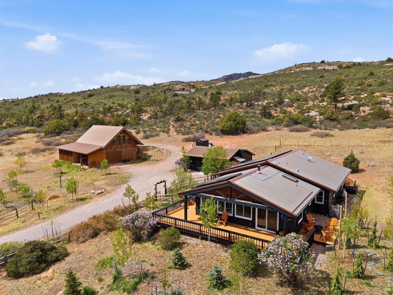 Welcome to 69 Juniper Ridge Rd-an expansive 38.8-acre mountain-meets-valley retreat in Bonner Peak Ranch in Laporte, just off Highway 287 north of Fort Collins. This property delivers privacy, adventure, and a slower pace of life. The updated Nordic-style ranch home offers 1,858 sq ft with 3 bedrooms, 2 bathrooms, a dedicated laundry room, and a bright, window-filled living space. The simple, no-basement layout is both functional and accessible. A large wraparound deck captures all-day sun and shade with sweeping valley views-ideal for relaxing or entertaining. The renovated timber frame barn (1,296 sq ft) functions as a versatile guest/recreation space with a kitchen, bath, bedroom, smart lighting, and a Dolby Atmos-wired rec room. Additional features include a private office, conditioned storage, and a large gym. The unfinished shop (1,452 sq ft) offers 220V power, space for 6-10 cars and a two-story climbing wall, and is ready for a car lift. A 2-car detached garage (448 sq ft) with subpanel for Level 2 EV charging. The land is built for exploration, featuring hiking and ATV trails, 4x4 terrain, mining-era remnants, crystal caves, geodes, and stunning 360 views from the top. Residents enjoy private access to hunting and fishing on the North Fork of the Poudre, plus forest hiking throughout Bonner Peak Ranch. Over $250K in upgrades enhance comfort and sustainability: a custom designer kitchen and baths, reclaimed wood floors, a 4-6 person barrel sauna with wireless control, 50+ new trees, orchard, vineyard, and garden. A 13.3 kW solar system with battery backup supports off-grid potential, complemented by a durable, hail-resistant steel roof. Located approximately one mile from the planned Glade Reservoir, this property offers potential future access to water recreation. A rare blend of privacy, functionality, and natural beauty-ideal for those seeking space, capability, and lifestyle.