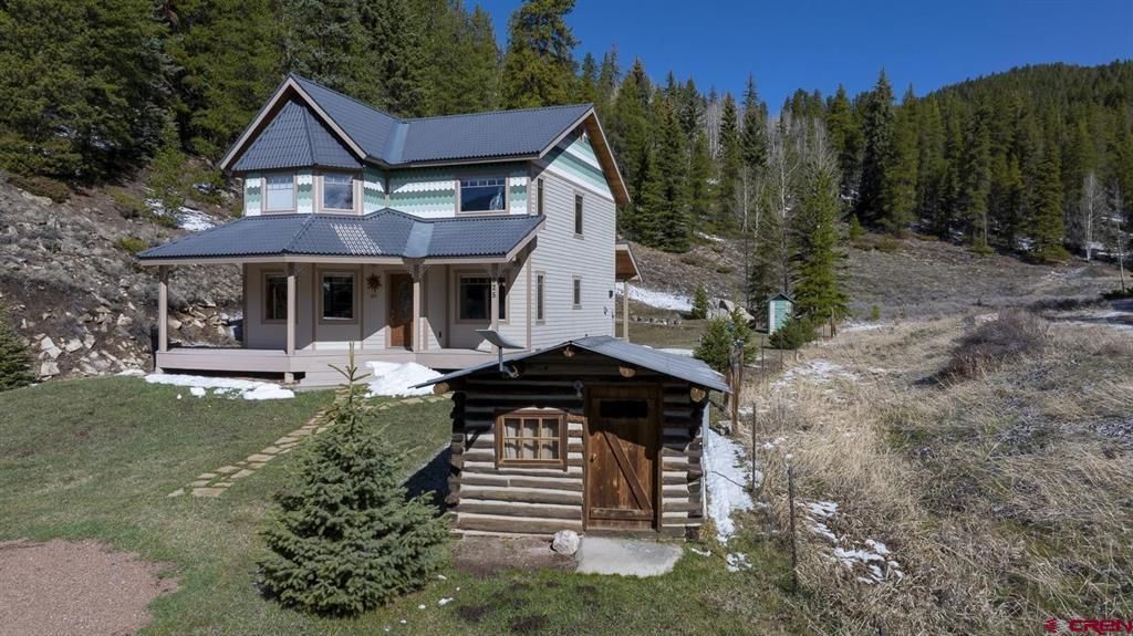 A Victorian style home built for mountain living. This well designed 3 bedroom, 2 bathroom, 1810 sq. ft. classic, set on 4.59 acres, was built just over 15 years ago. Thoughtfully designed, blending historic details and high-quality building materials. Covered front and back decks are built with AZEK (R) PVC decking. The metal roof, a classic Spanish tile look, by "Style" (R) roofing along with Hardie (R) plank siding provide durability and low maintenance for the high-mountain climate. Milgard (R) fiberglass windows with double cellular window shades enhance energy efficiency. The open-concept living room, dining room, and kitchen are bathed in natural light. The main level also features a spacious primary bedroom with a walk-in closet, double vanity bathroom, and a laundry room. A secondary living room and flex space, as well as two generously sized bedrooms and full bathroom are all upstairs. Desing features include engineered Hickory hardwood floors throughout the main level, solid pine interior doors, and radiant in-floor heat on both levels. The kitchen highlights the combination of historic charm and modern functionality with the Elmira Stove Works electric 6-burner glass-top and stove. An over 5-foot-deep lined crawlspace, is a real plus, offering ample storage and easy access for maintenance. The nearly 5-acre property includes a walking trail through wooded and sagebrush areas, providing opportunities to view wildlife and enjoy the stunning views of Pitkin and the Quartz Creek Valley. The backyard also features a fire pit, perfect for starlit gatherings with friends and family. In addition to this stunning home, there is an historic old miner's cabin (restored in 2010, adding electricity). It even has the original outhouse from the Pitkin Community Church. There is a 4-car garage on an adjacent parcel (823 Main St.) included in the listing. The loft above the garage is home to a "mini-museum" filled with many artifacts found on the property over the years. The collection provides a snapshot of the history of the Pitkin area. The town of Pitkin is located in the heart of Gunnison National Forest and provides access for year-round activities, including hiking, biking, fishing, hunting (GMUs 55 & 551), ATV-ing, snowmobiling, and 2 ski resorts about an hour away. This "turnkey" opportunity includes most all of the furniture and contents. The obvious pride of ownership make this a "home to see".